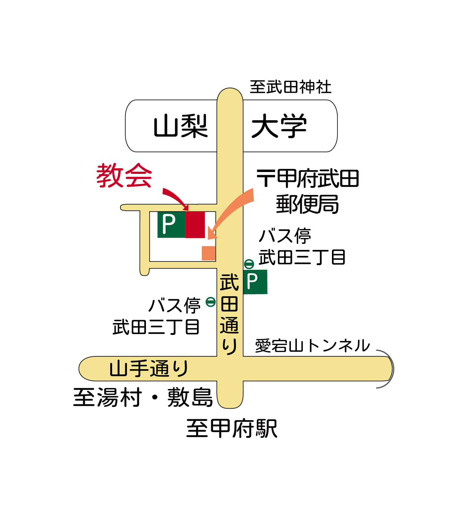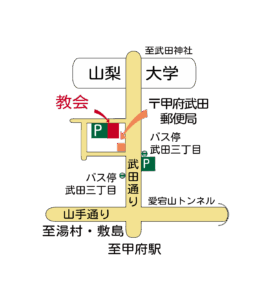 アクセス 2017年2月7日 に yoko が投稿 JR甲府駅より徒歩15分(山梨大学の南) お車でお越しの際は、 ①武田通りの東側の駐車場か、 ②郵便局(甲府武田郵便局)南側より入り、突き当りを2回右折して、 教会前の駐車場をご利用ください。 駐車場にはゆとりがありますので、どうぞ遠慮なく駐車してください。 所在地:甲府市武田3-17-4(教会) TEL :055-253-4560 ~アクセスマップ~ GoogleMapを拡大表示すると教会の位置が表示されます。